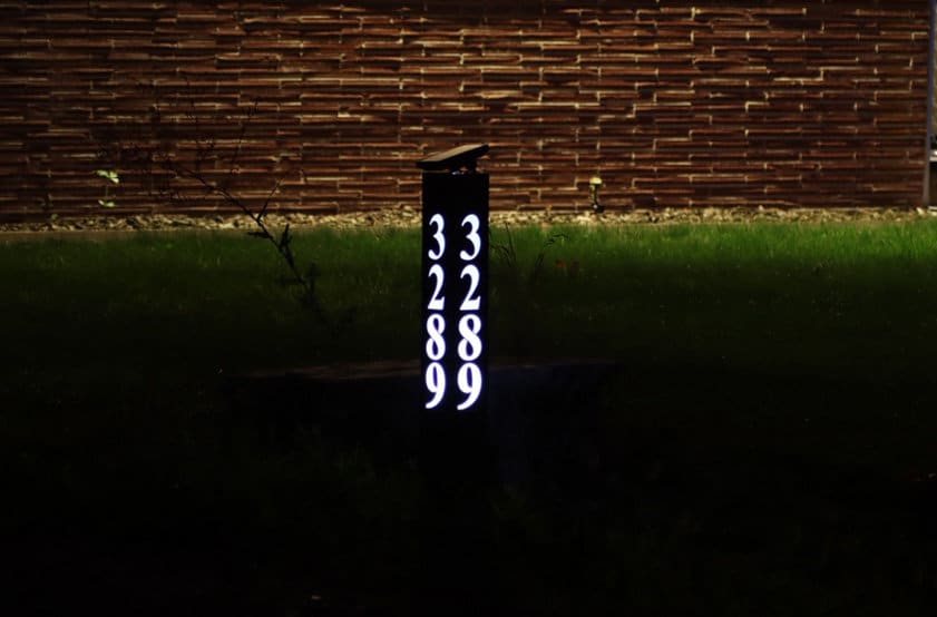 These unique, classy looking solar powered LED lit signs can be customized with your address numbers, and if desired your last name, business name, or street name on UP TO THREE sides.