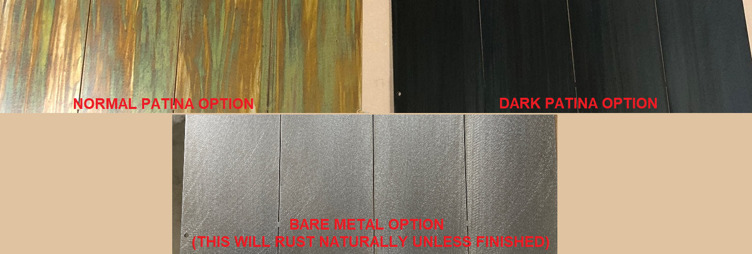 The Patina Finish is shown in the pictures, finish will vary from piece to piece. Bare steel (not shown complete) option may have light rust on it when delivered, you can let it rust naturally, or prep and paint yourself, bare steel will rust quickly if not finished. The Dark patina option shown is a dark brownish black color, again will vary from piece to piece. The Patina finish will age over time. I offer a stainless-steel version for harsher environments such as coastlines.